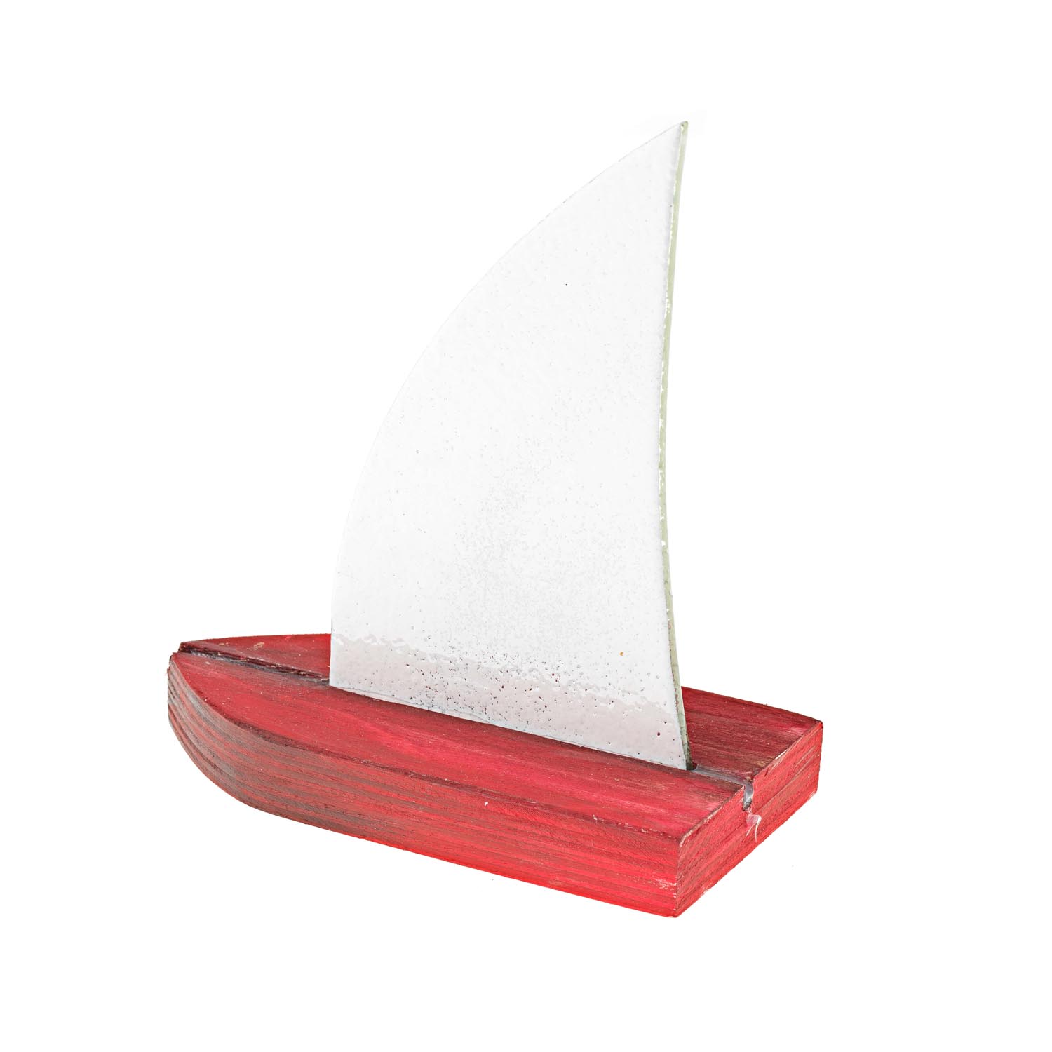 Χειροποίητη διακοσμητική κατασκευή “Καράβι” με ξύλινη βάση και συνολικό ύψος 12cm και πλάτος 8cm. Το γυαλί είναι από βάση float γυαλί, χρωματιστά θραύσματα γιαλιού σε διαδιάφορα μεγέθη, ειδικά ζωγραφικά σμάλτα , ψημένα σε κλίβανο με υψηλές θερμοκρασίες που φτάνουν τους 825 βαθμούς κελσίου.