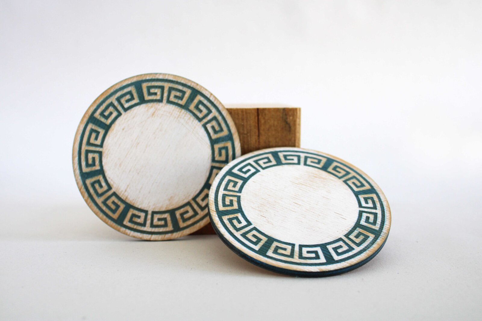 Σουβέρ από ξύλο σε γαλάζιο χρώμα με χαραγμένο αρχαιοελληνικό μοτίβο (τεμάχια 2) διάσταση 9 εκ.